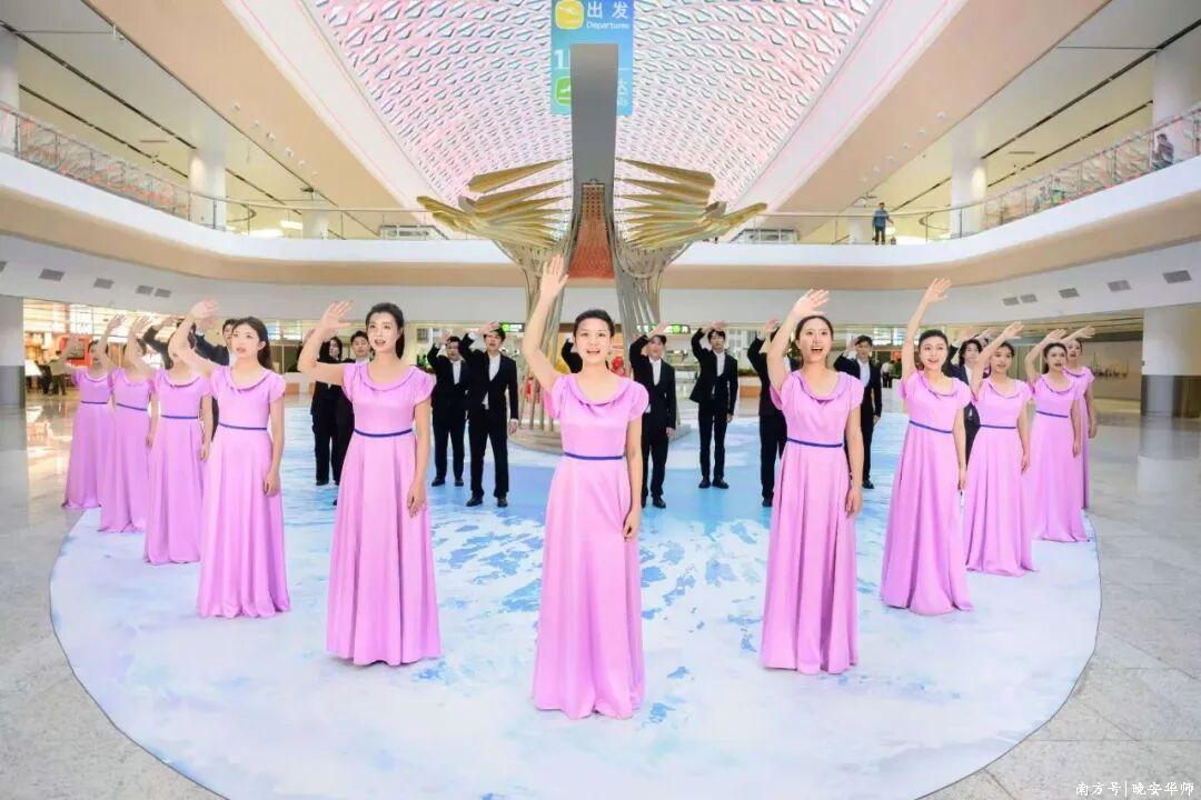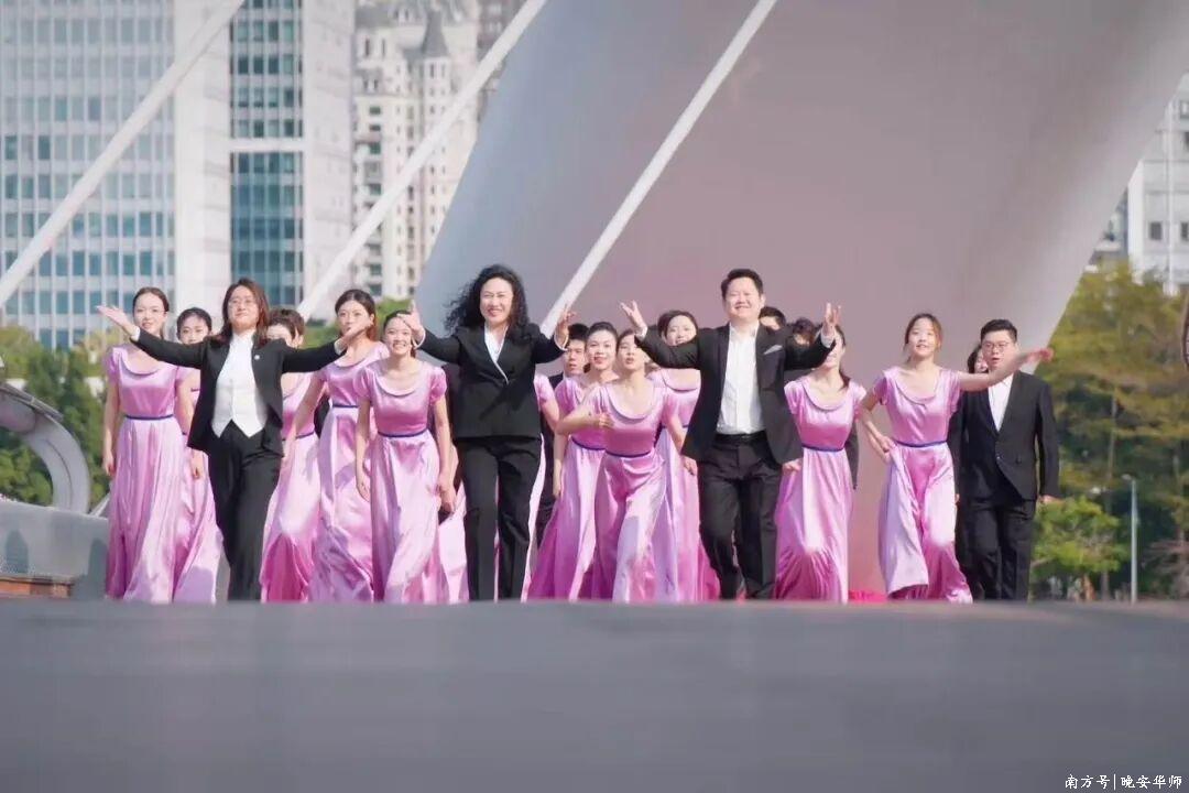 高效创作的背后,是多团队的专业协作。华师党委宣传部、音乐学院积极统筹协调策划、创作、拍摄等工作;广州市广播电视台拍摄团队在春节前的繁忙时期全力支持,不仅留出充足拍摄时间,还最大程度调动设备资源;录音团队连夜完成音频制作;合唱团的同学们在寒假期间克服困难返校排练;广州地铁集团、广州城投集团、广州白云国际机场股份有限公司等单位积极协调相关拍摄场地。