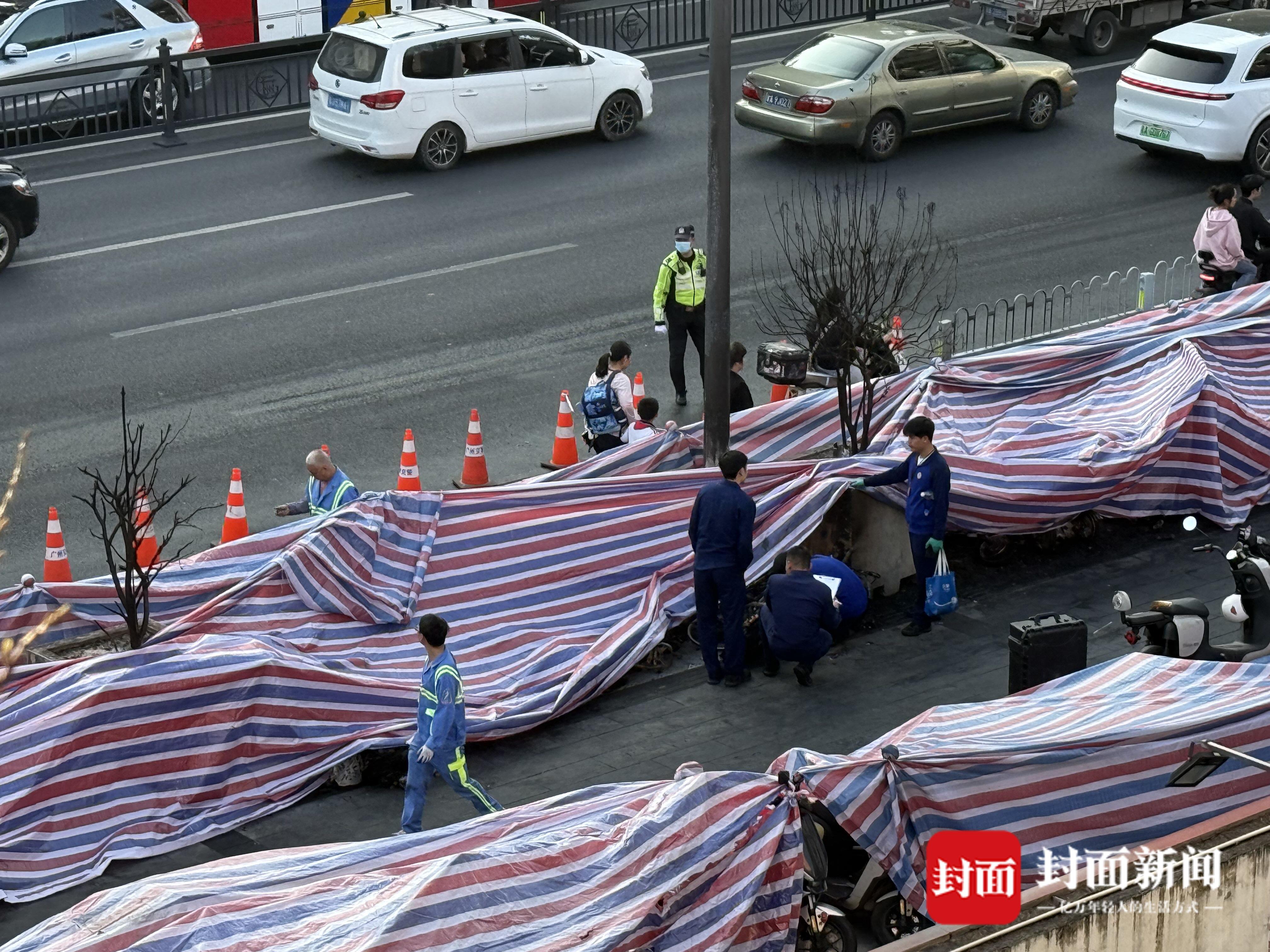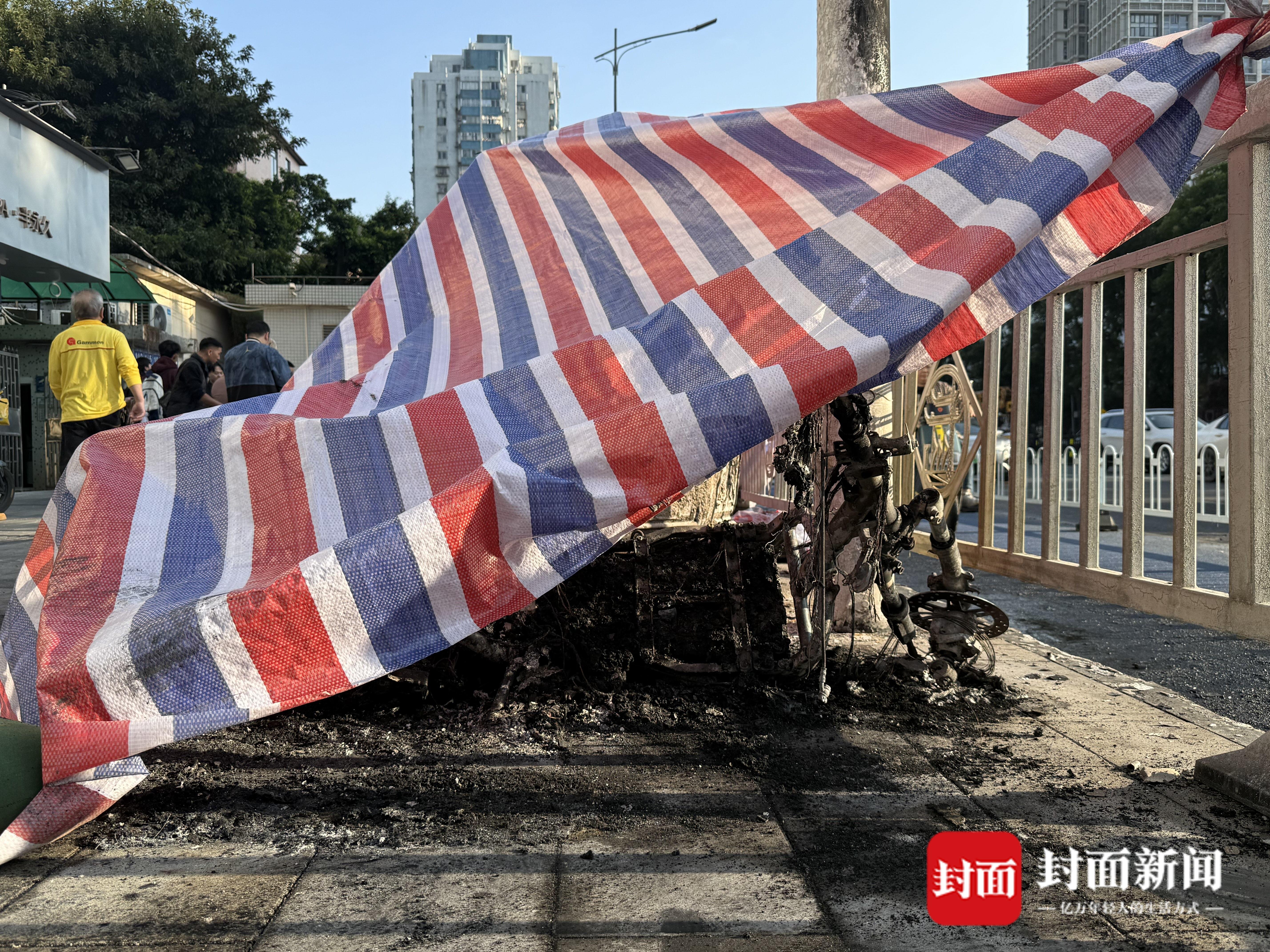 12月1日16时许,封面新闻记者在现场看到,过火路面上有明显黑色痕迹。停在沙园地铁c出口路沿上的数十辆电动车被烧到只剩残骸,沙园地铁站的指示牌在火情中也损坏严重。
