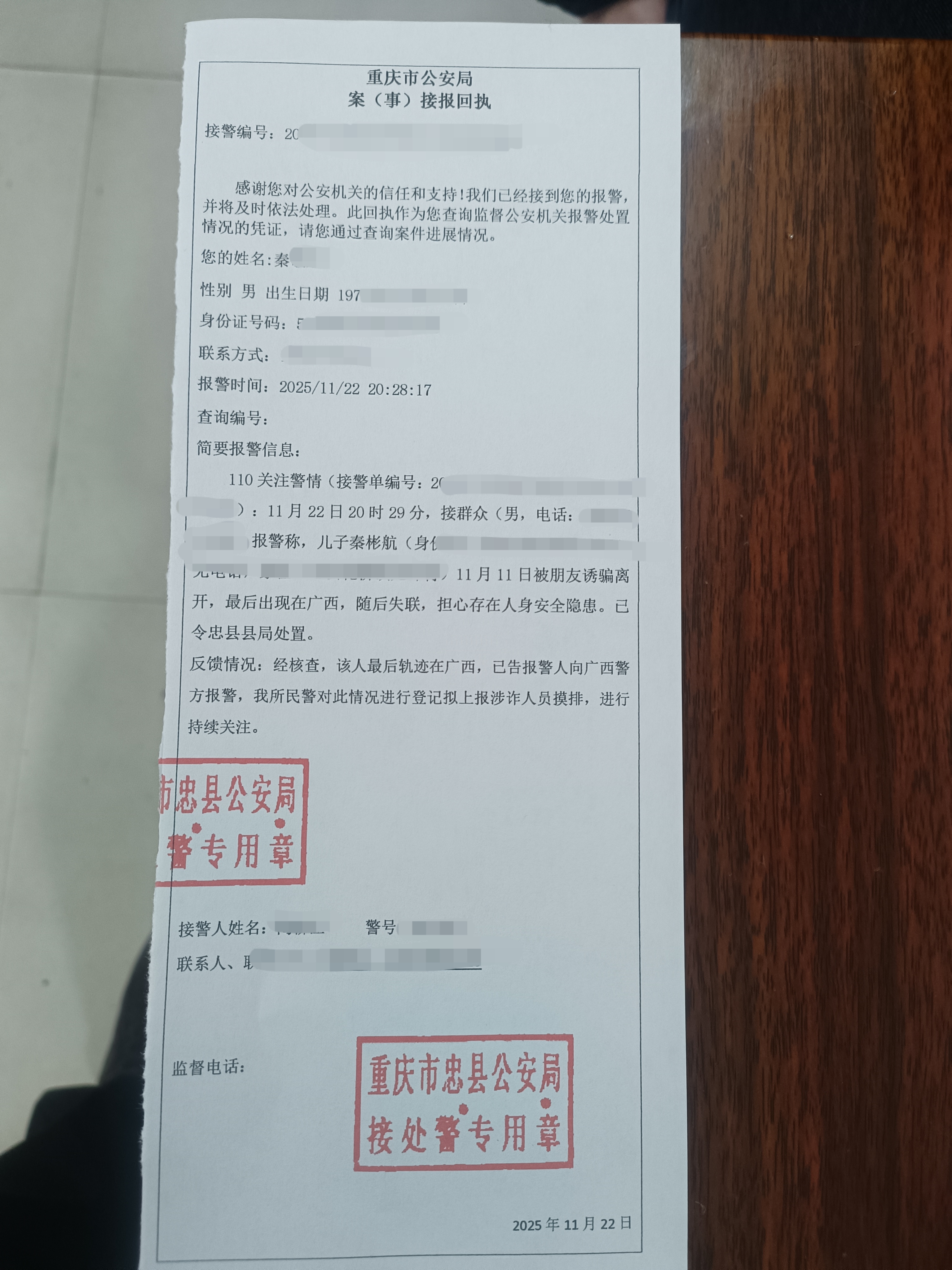 11月22日,秦先生回到户籍地忠县,再次向当地警方报案。据忠县公安局出具的报警回执单,秦先生报警称,儿子秦彬航11月11日被朋友诱骗离开,最后出现在广西,随后失联,担心存在人身安全隐患。